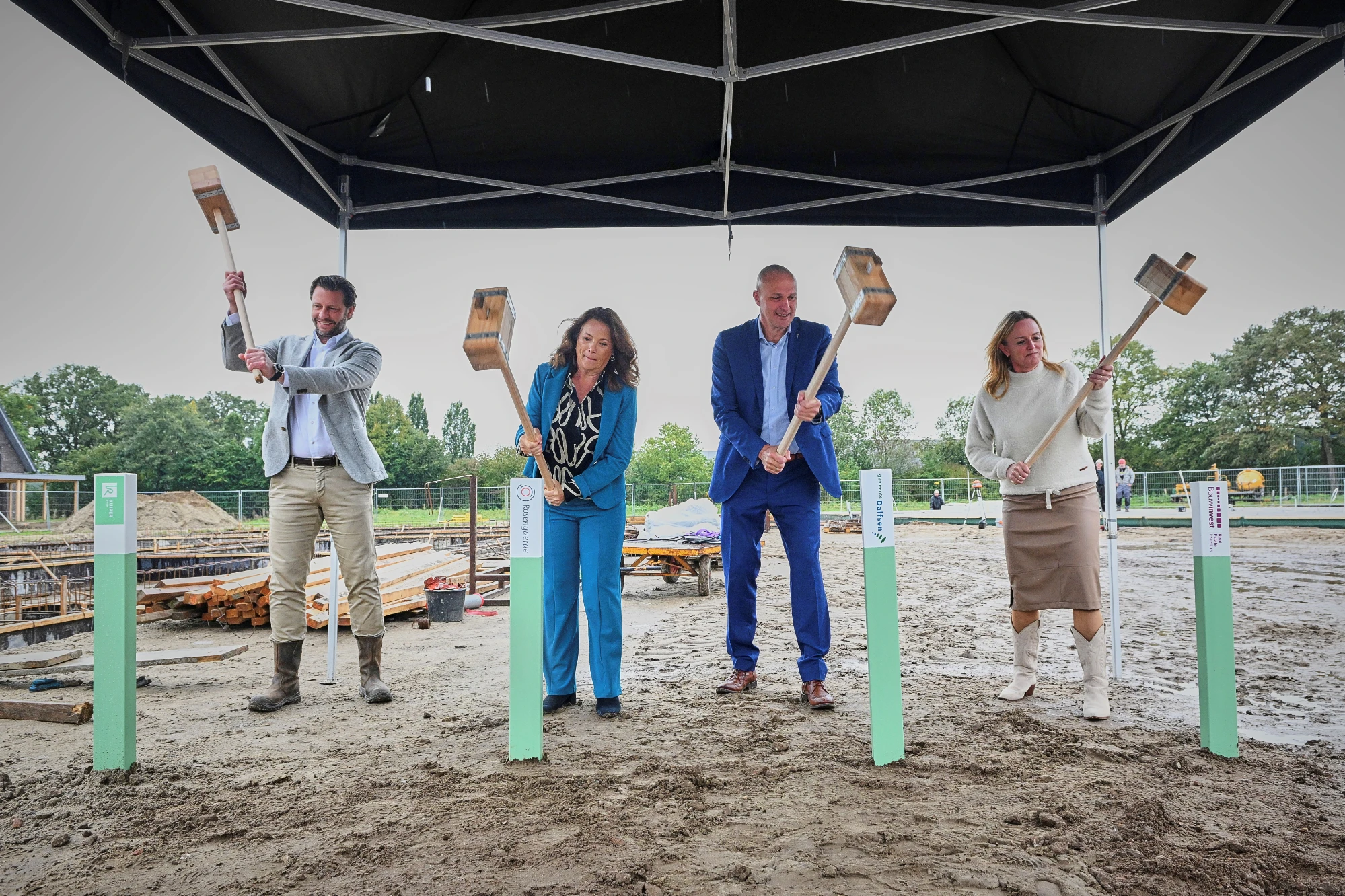 De officiële handeling vond buiten plaats, naast de bouwput waar inmiddels de contouren van het nieuwe zorggebouw al zichtbaar zijn. Bestuurder Margot Seip van Rosengaerde, wethouder Andre Schuurman van de gemeente Dalfsen, acquisitiemanager Monique Tetteroo van het Bouwinvest Dutch Healthcare Fund en algemeen directeur Bob Winters van Kuiper Groep sloegen op symbolische wijze vier palen in de grond. Daarna werd op de bouwplaats geproost en met enthousiasme nagepraat over het nieuwe woonzorgcentrum in wording.